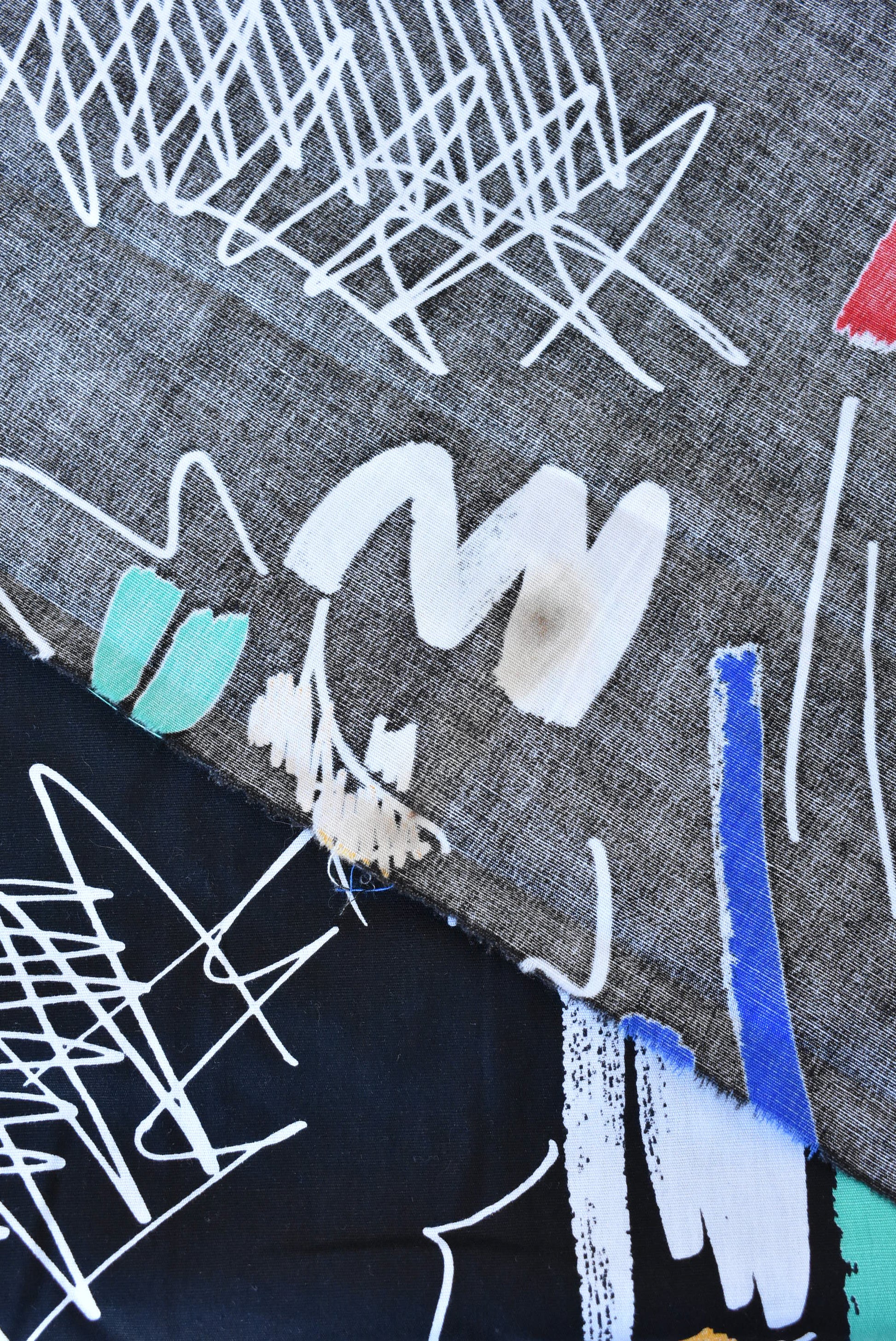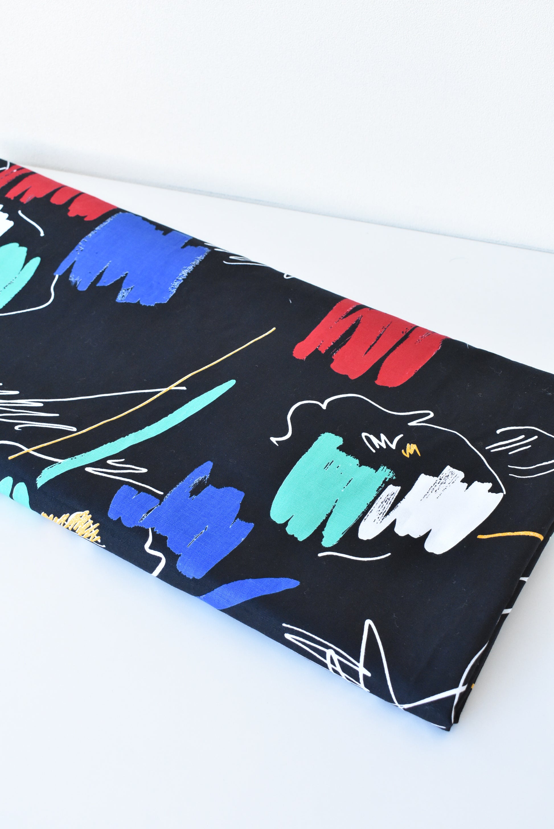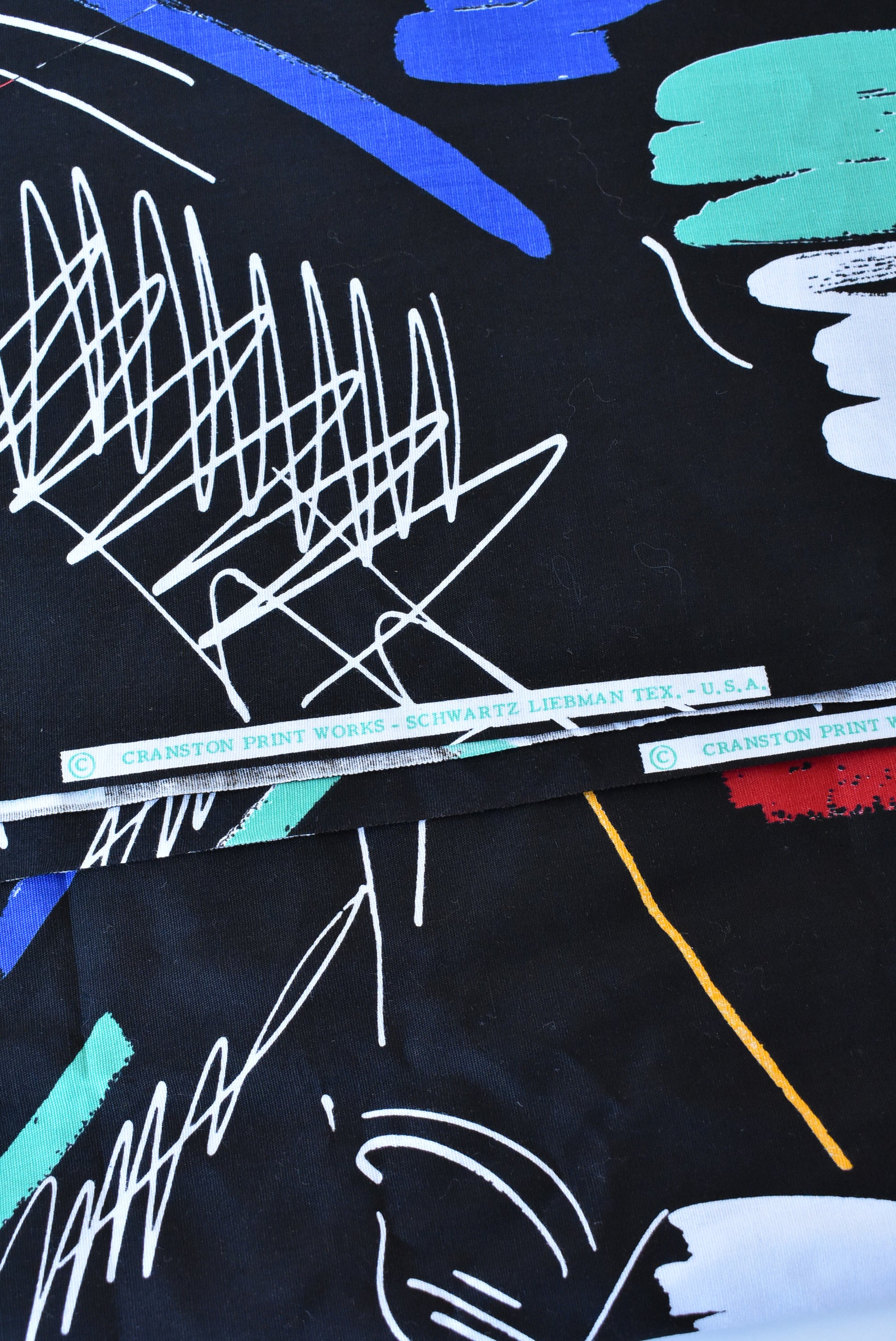 - Description: Incredible retro late 1970's to early 1980's Schwartz Liebman fabric, Texas USA. Bright teal, red, blue, yellow and white 'scribbles' on black backround.