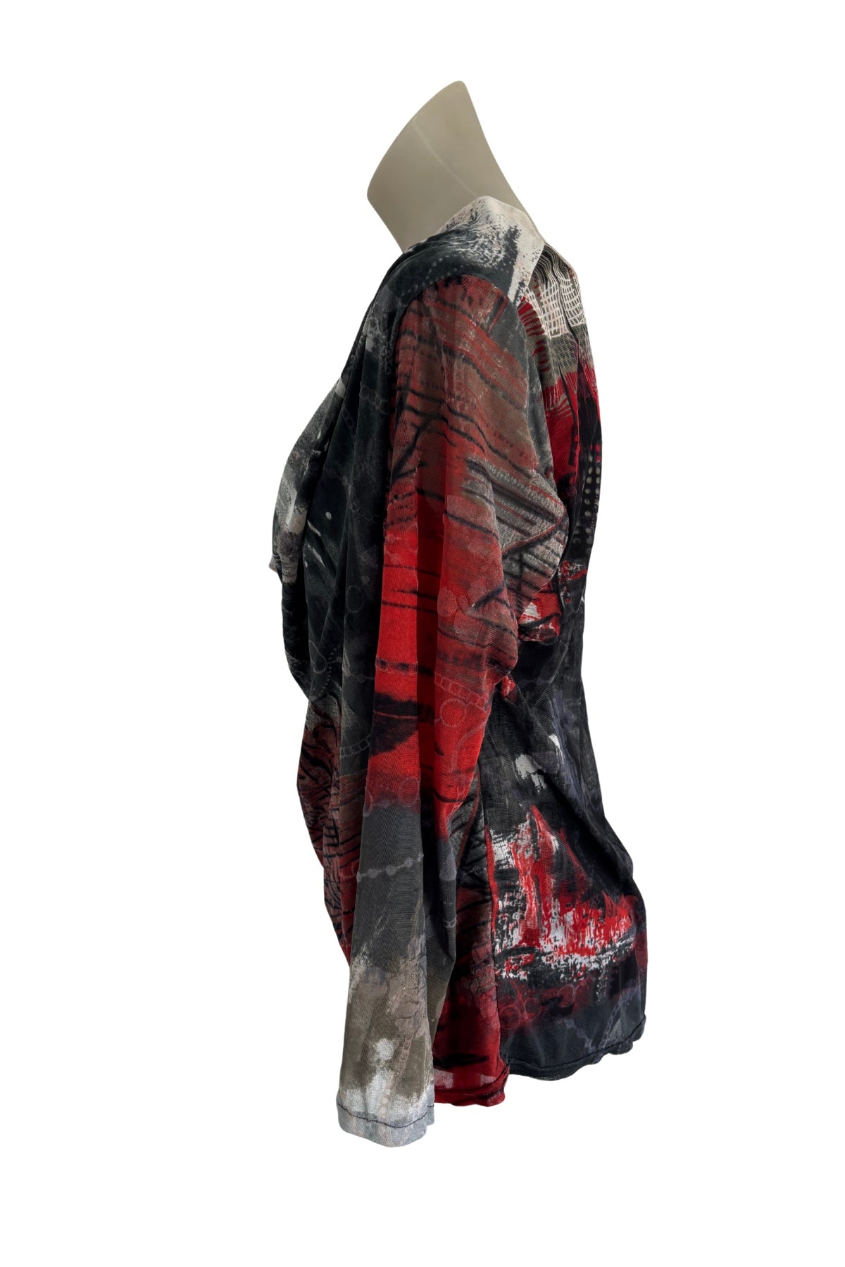 - Description: The Blase cowlneck blouse in size 14 features a striking red, grey, and black grunge pattern, blending edgy style with elegant design. Its soft fabric and relaxed cowl neckline offer comfortable wear, making it a versatile piece that adds character to both casual and dressier looks.