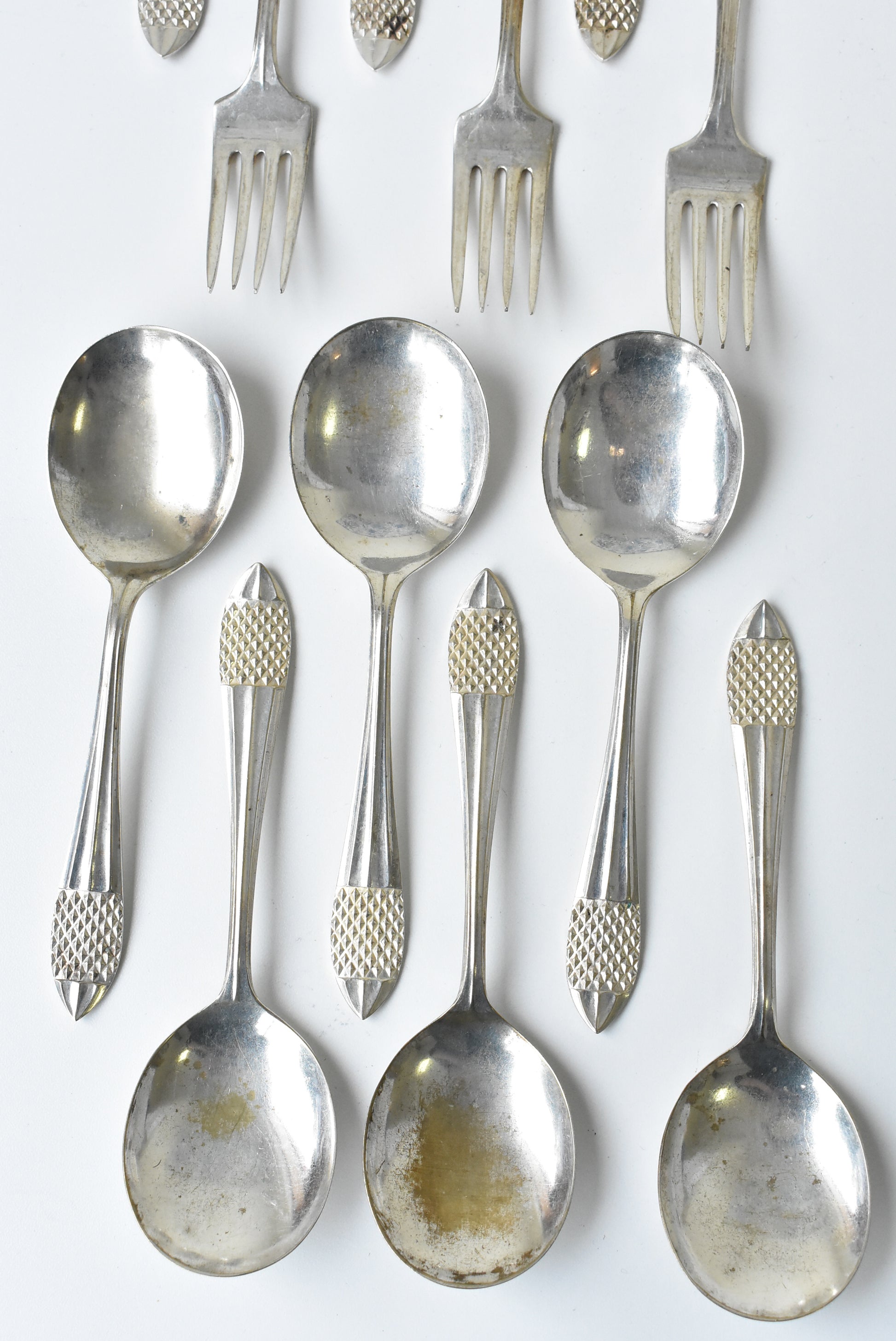 - Description: Electroplated nickel silver dessert cutlery set, 6 spoons and 6 forks with unusual diamond pattern in a blue box (not original box).
