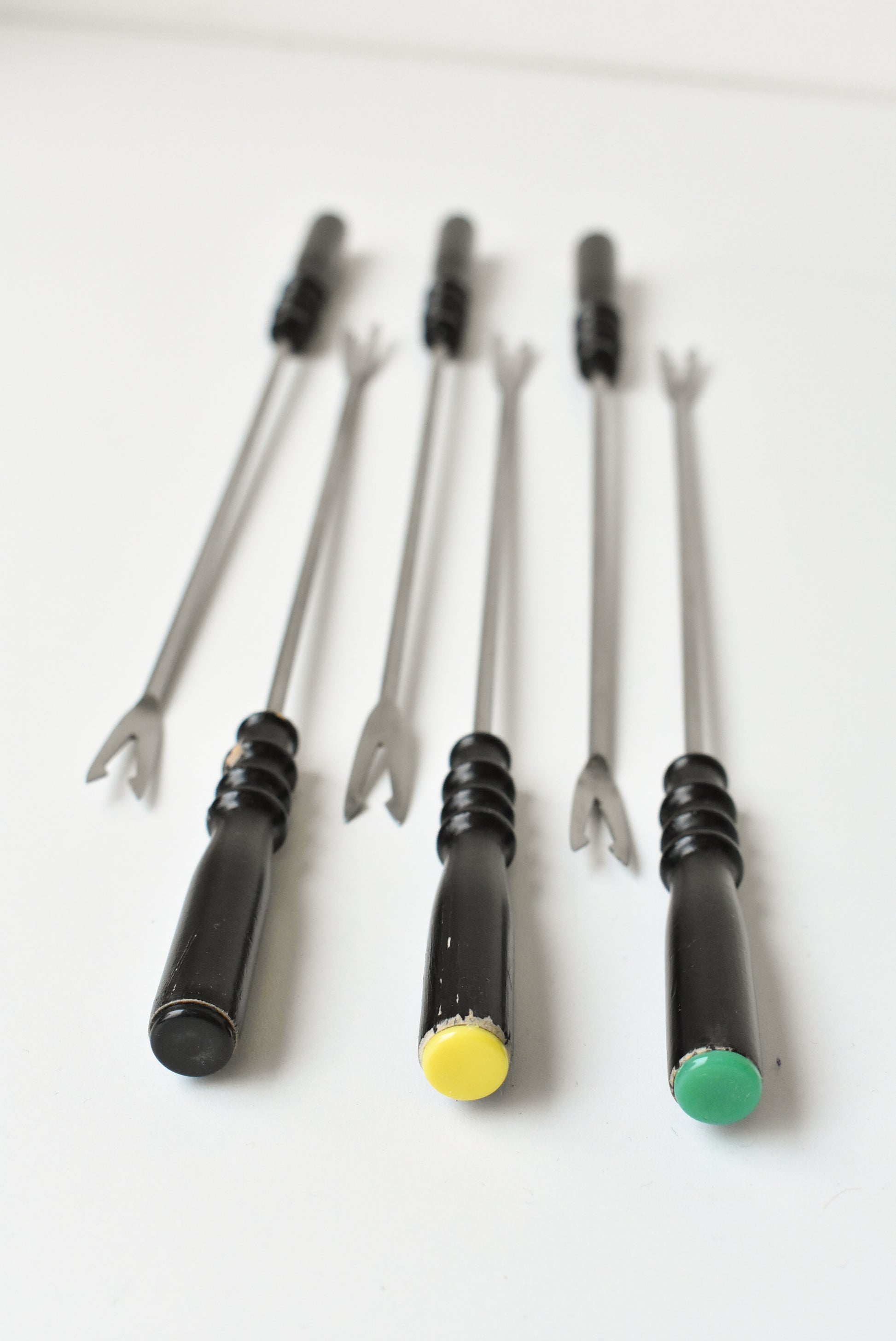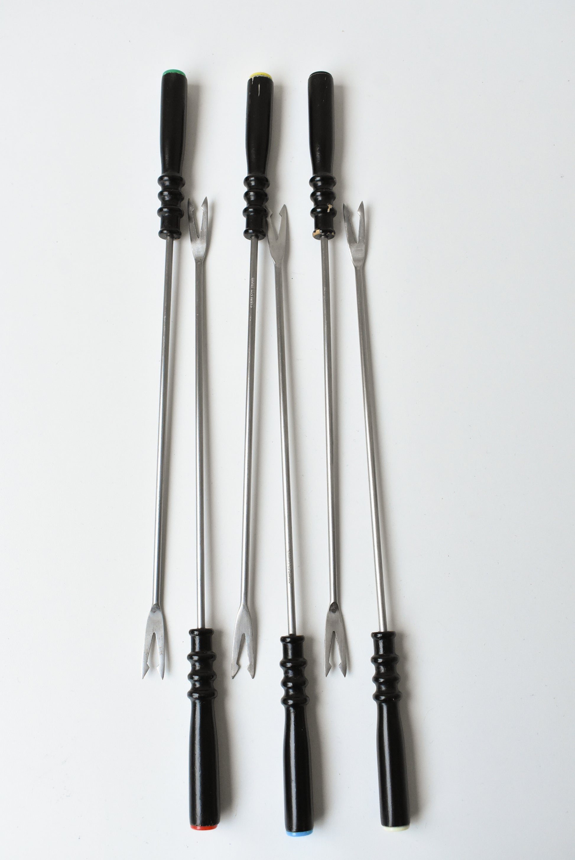 - Description: Mediterranea stainless steel six piece fondue fork set with different coloured bottoms to help differentiate the forks between people using them
