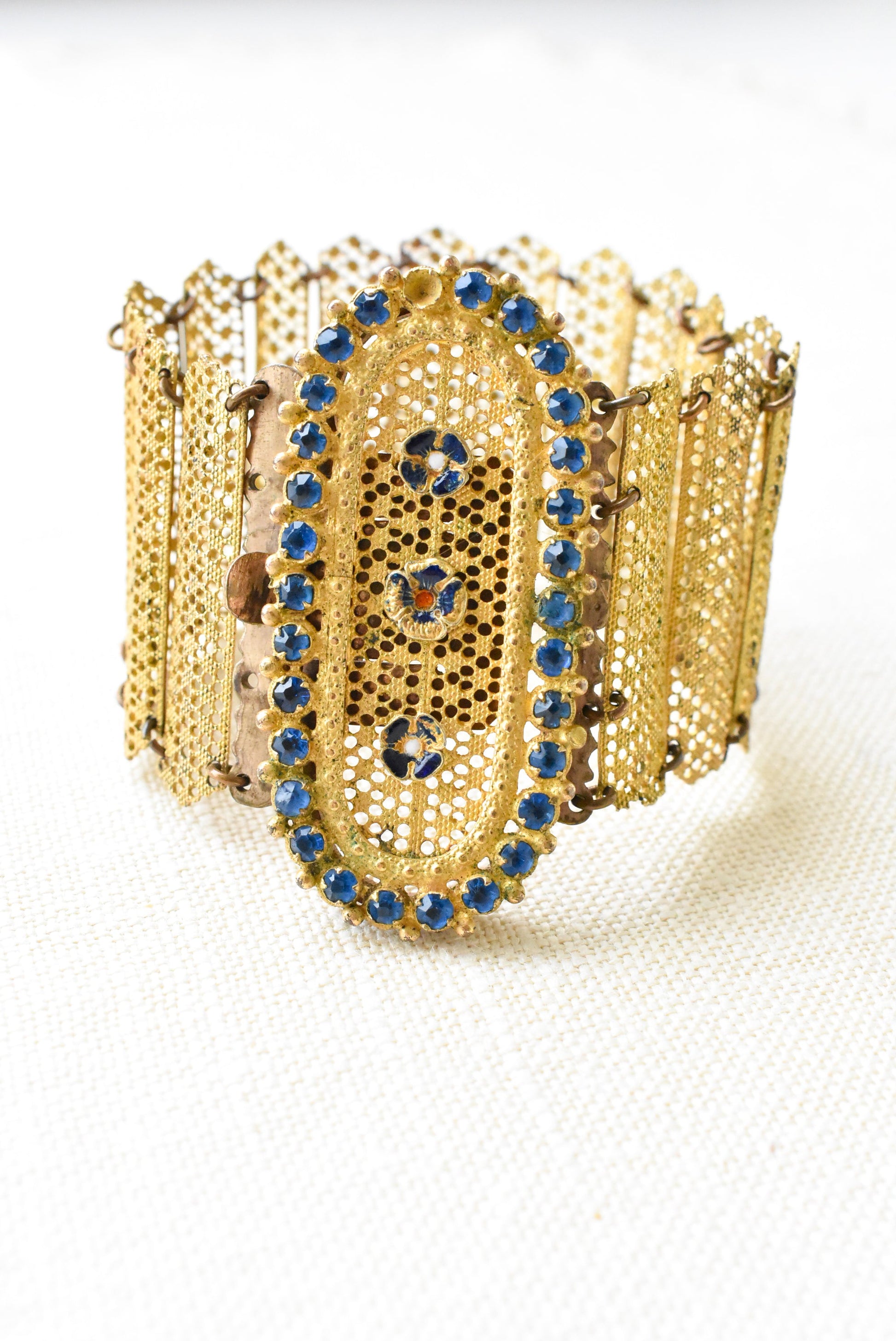 Description: focal emblem is three small blue flowers (we think enamel) set in an oval, edged with blue prong-set gems; bracelet chain is made of narrow panels, very fine, lace-like and golden.